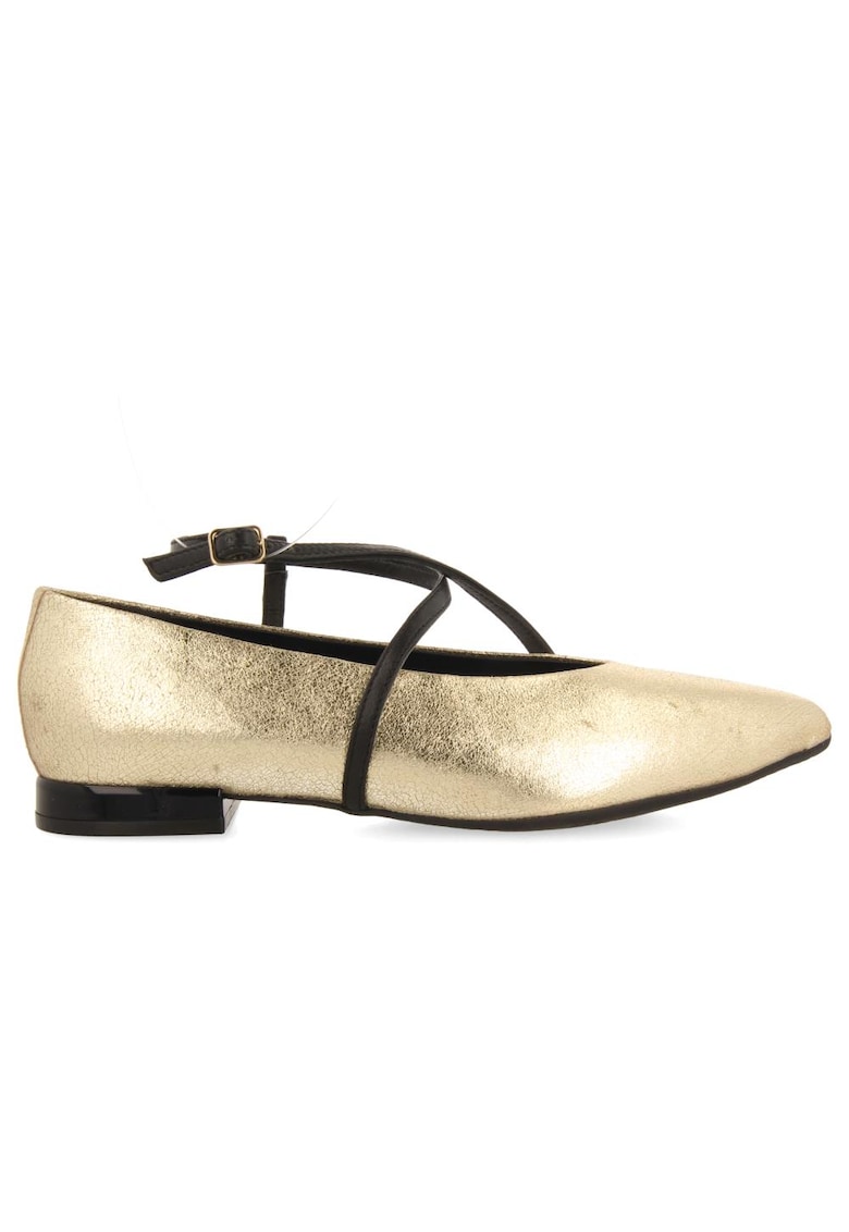 Характеристики Цвят: златист Материал: eстествена кожа Принт: без принт Стил: ежедневен Връх: остър Детайли: метализиран ефект Закопчаване: катарама Състав Горна част: кожа Материал интериор: кожа Материал подметка: други материали