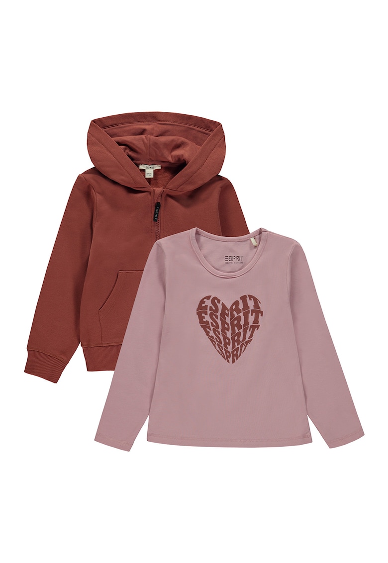 Характеристики Съдържание пакет: худи с цип и блуза Цвят: канелено кафяво – прашно розово Стил: ежедневен Принт: лого Кройка: стандартна Материал: памук Закопчаване: цип Деколте: кръгло Дължина ръкав: дълъг ръкав Джобове: странични Състав Външна част: 100% памук