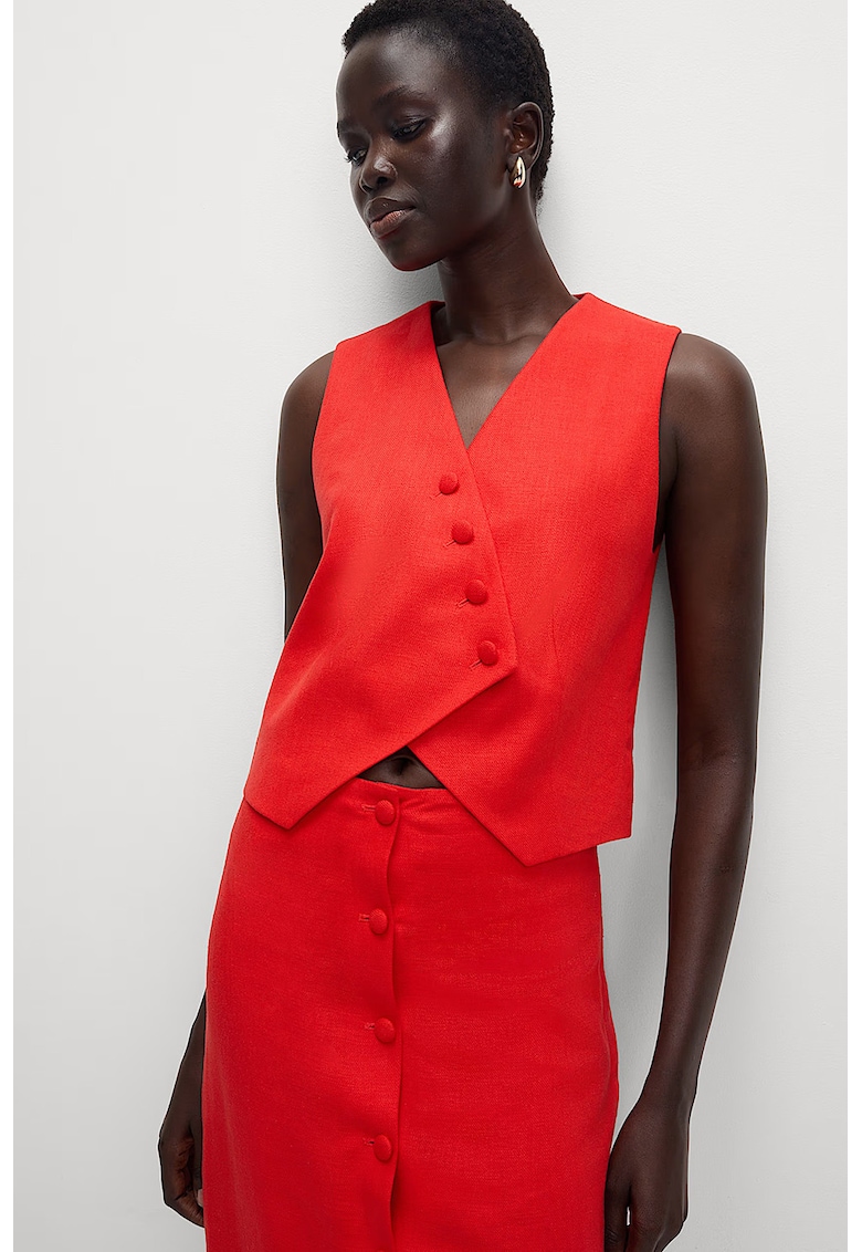 Характеристики Тип продукт: елек Цвят: аленочервен Принт: без принт Материал: вискоза – лен Кройка: асиметрична Дължина ръкав: без ръкав Закопчаване: копчета Състав Външна част: 55% лен – 45% вискоза