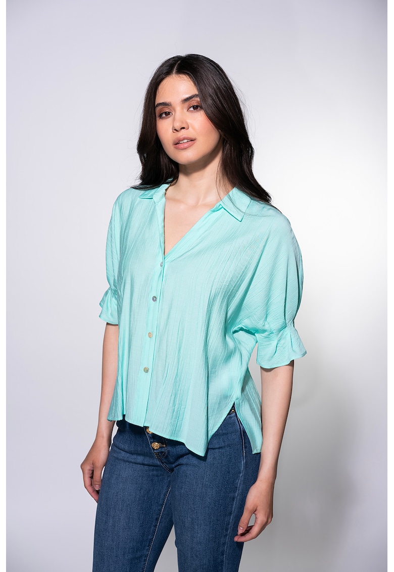 Характеристики Цвят: ледено синьо Принт: без принт Стил: ежедневен Материал: вискоза – найлон Кройка: свободна Дължина ръкав: къс ръкав Закопчаване: копчета Състав Външна част: 85% вискоза – 15% найлон