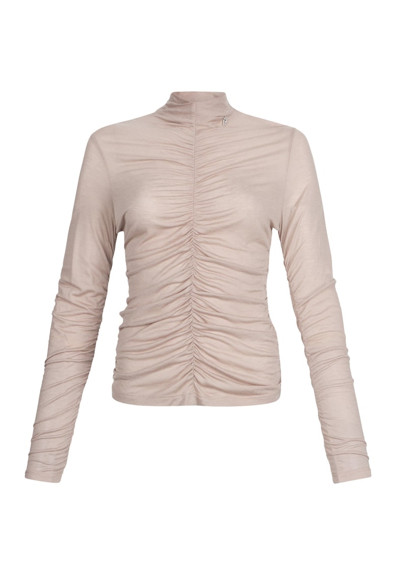 Характеристики Цвят: бежов Принт: без принт Стил: ежедневен Кройка: по тялото Закопчаване: без закопчаване Материал: вълна – модал Яка: ниска Дължина ръкав: дълъг ръкав Детайли: набирания Състав Външна част: модал – вълна