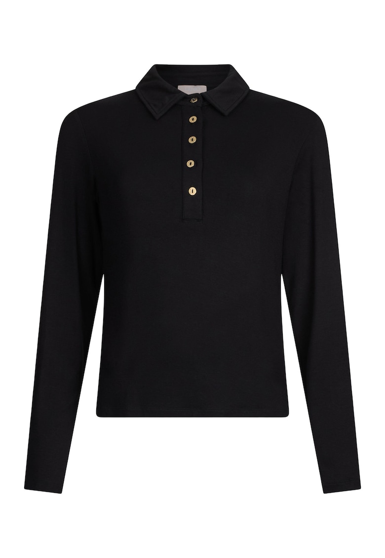 Характеристики Цвят: черен Принт: без принт Стил: ежедневен Кройка: стандартна Материал: вискоза Яка: поло Дължина ръкав: дълъг ръкав Състав Външна част: еластан – вискоза