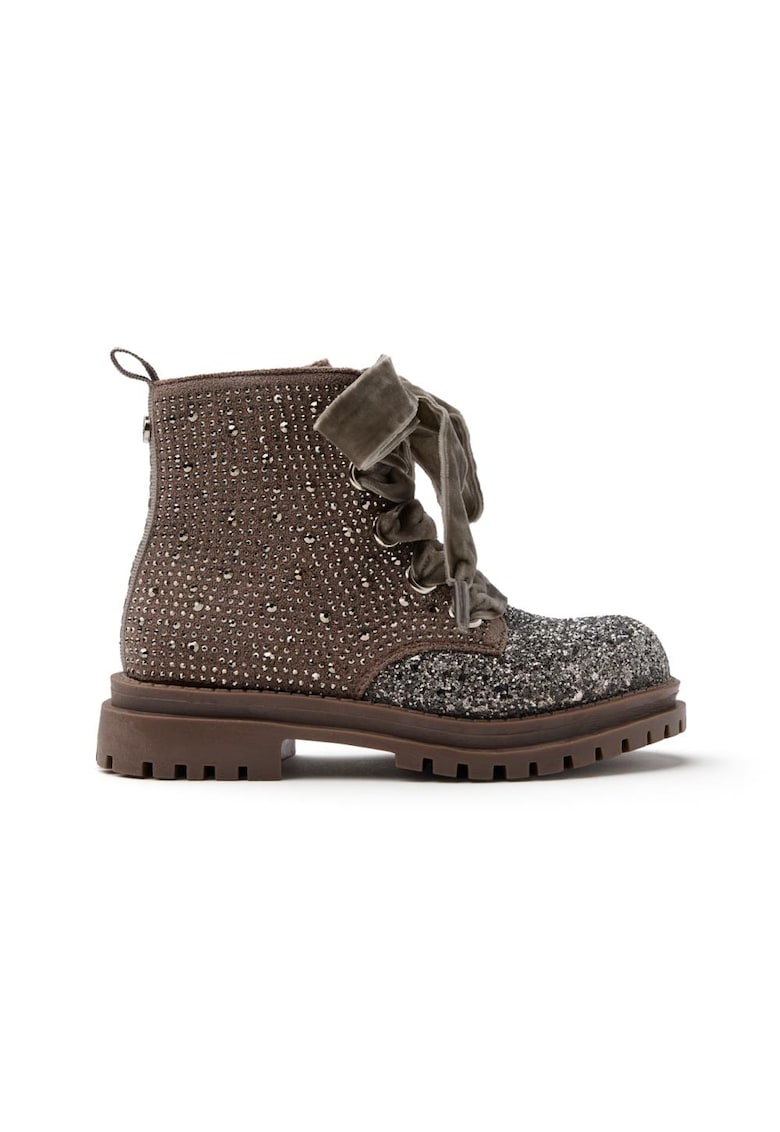 Основни характеристики Тип продукт: боти Цвят: сиво-кафяв Материал: текстил – синтетичен Стил: ежедневен Дължина: глезен Закопчаване: връзки – цип Детайли: декоративни камъни – лъскави елементи – кадифени връзки Детайли материал Горна част: други материали – текстил …