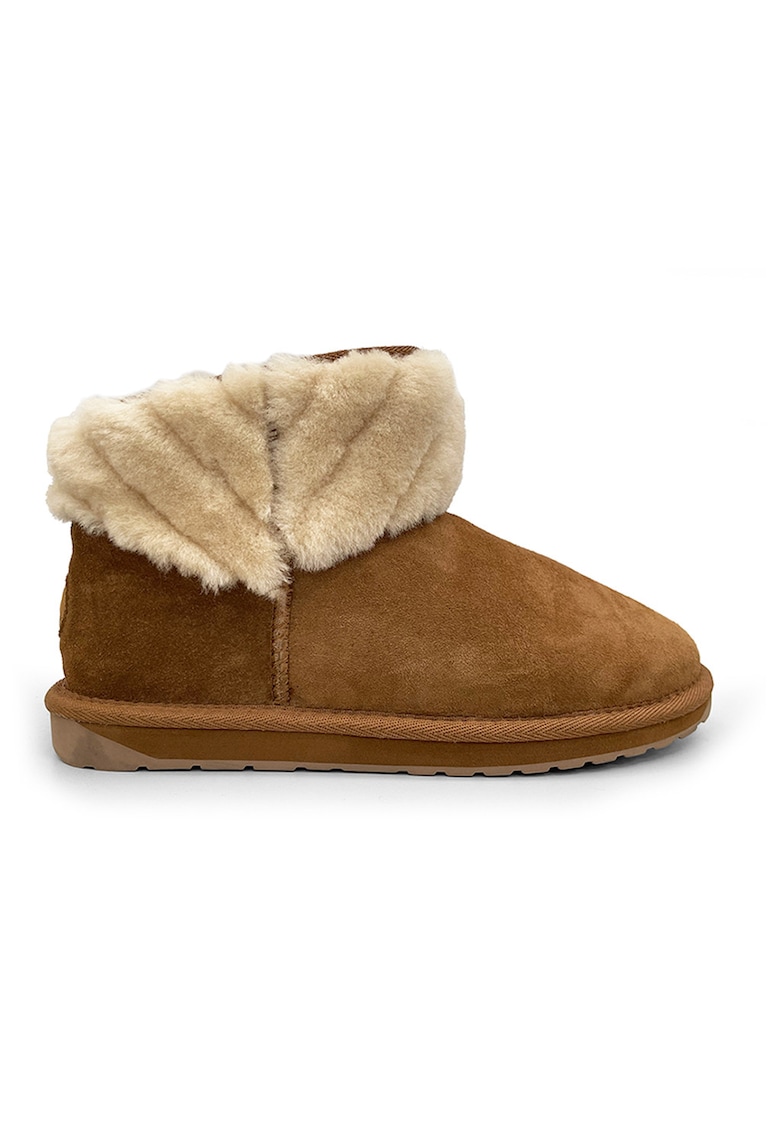 Характеристики Тип: ниски Цвят: карамел – мръснобял Материал: велур Стил: ежедневен Връх: кръгъл Състав Горна част: велур Материал интериор: вълна Материал подметка: други материали