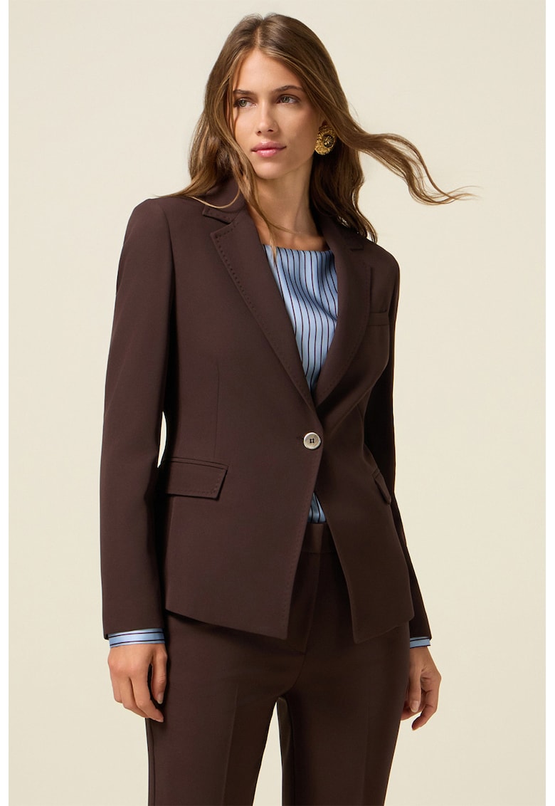 Характеристики Цвят: тъмнокафяв Стил: елегантен Кройка: по тялото Материал: синтетичен Принт: без принт Яка: ревери Дължина ръкав: дълъг ръкав Закопчаване: копчета Състав Външна част: 92% полиестер – 8% еластан