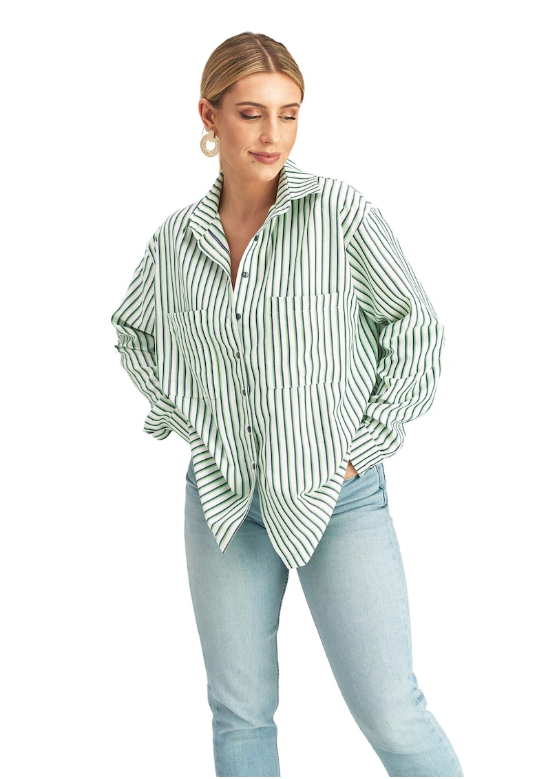 Дамска елегантна риза модел M1024 – зелено-бели райета – полиестер и вискоза Figl