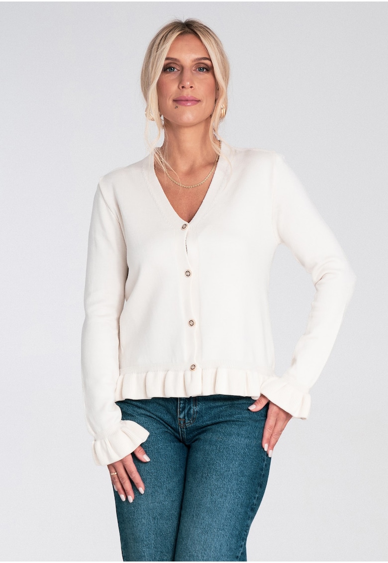 Дамски пуловер – екрю – волани – V-образно деколте – мека вискозна плетка Figl
