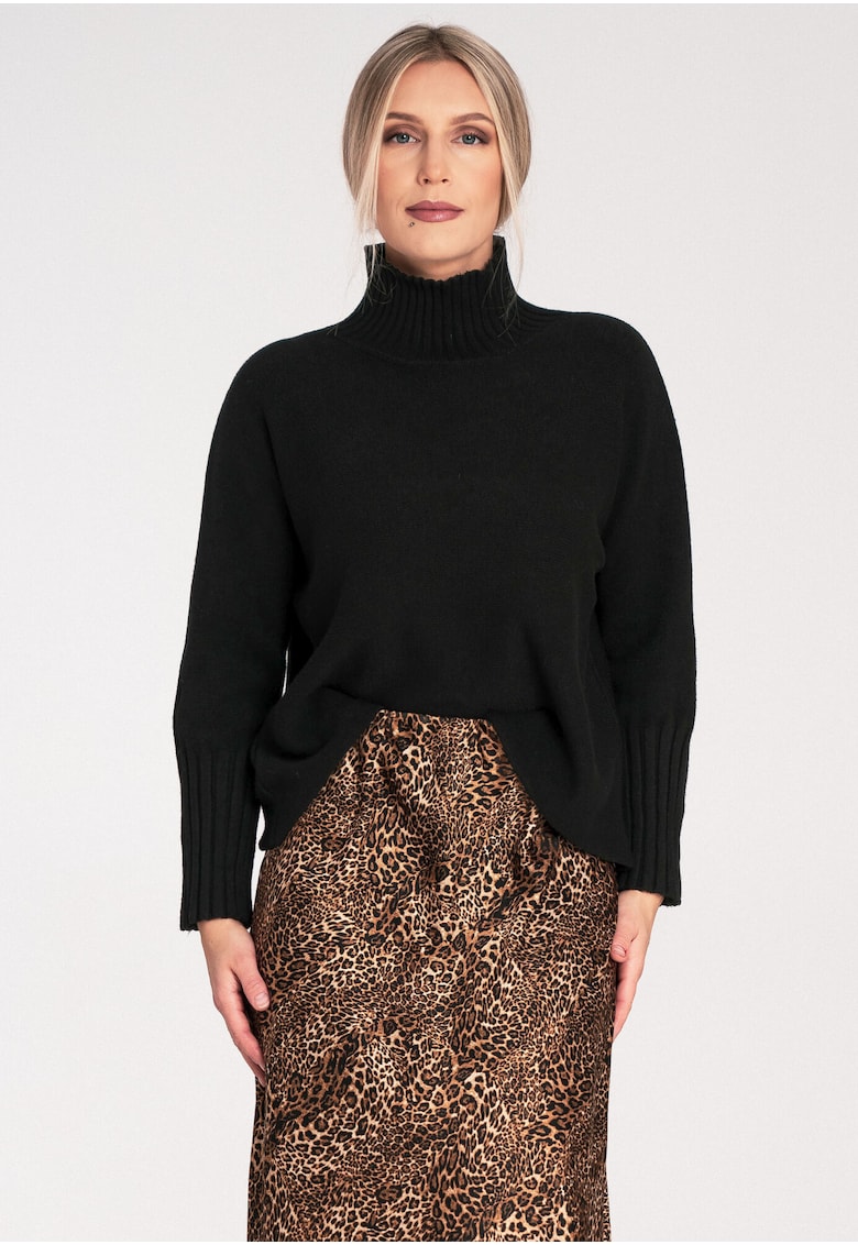 Относно Дамски пуловер – елегантен – с яка – черен – плетен плат – SM Figl