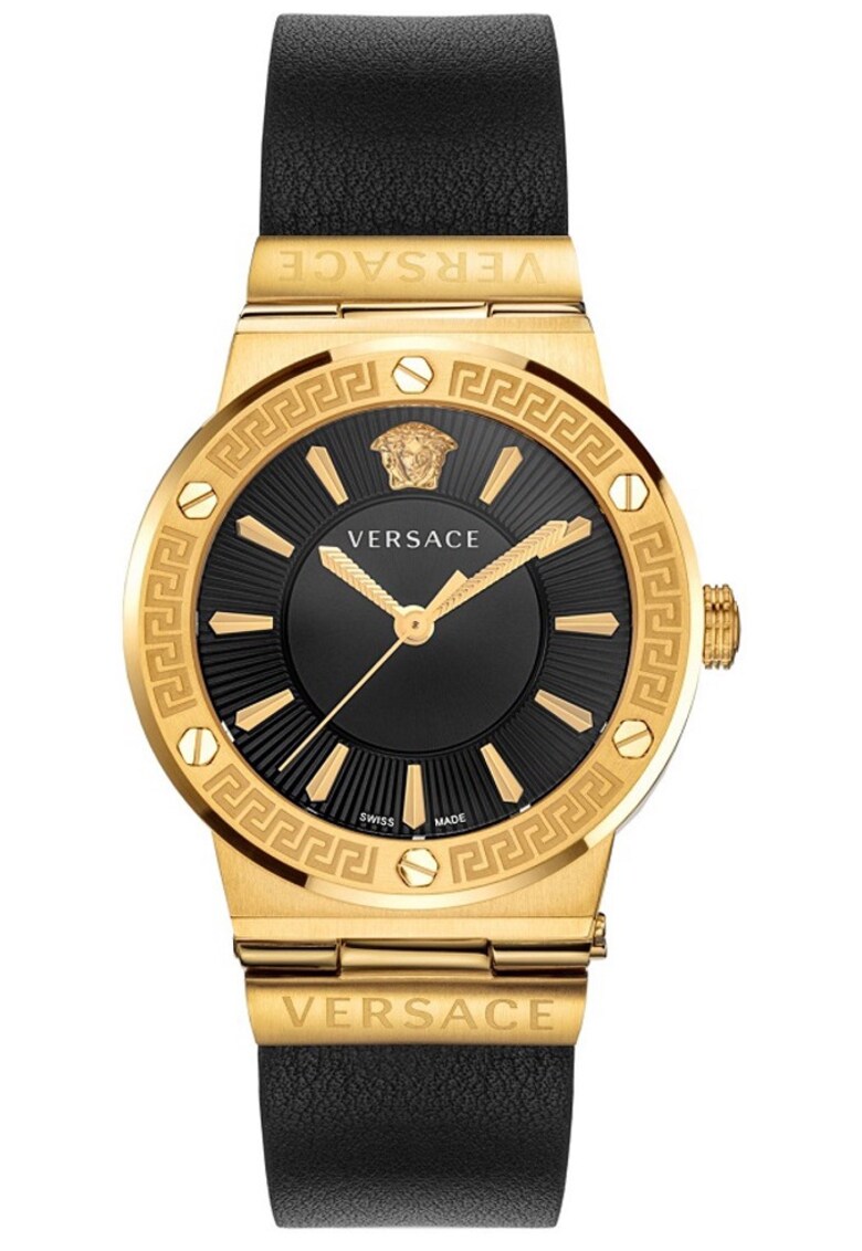 Дамски часовник модел Greca Logo – неръждаема стомана/кожа – 38мм – водоустойчив на 5 ATM – черен/златист Versace