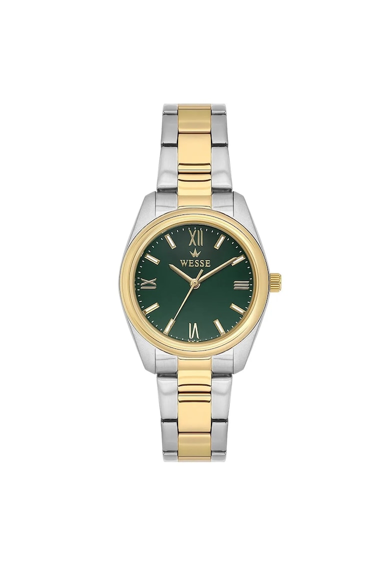 Относно Дамски часовник модел WWL112205 – кръгъл корпус 32мм – златист/сребрист – стоманена каишка – зелен циферблат – 5 ATM Wesse