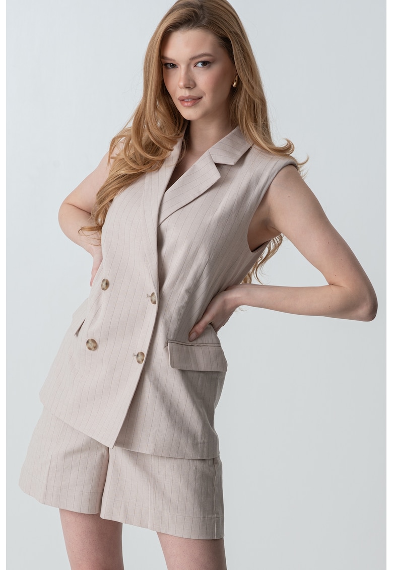 Характеристики Цвят: бежов Стил: елегантен Кройка: стандартна Материал: памук – лен Принт: райе Яка: ревери с цепка Дължина ръкав: без ръкав Закопчаване: копчета Състав Външна част: 86% памук – 13% лен – 1% еластан Подплата: 100% полиестер Информация за модел Моделът е облечен с …