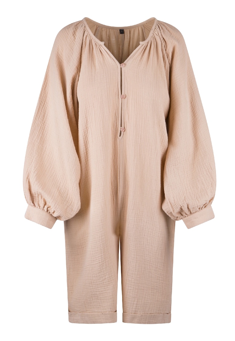 Характеристики Тип продукт: гащеризон Цвят: бежов Материал: памук Принт: без принт Деколте: шпиц Кройка: свободна Дължина ръкав: три четвърт Дължина панталон: къс Закопчаване: копчета Състав Външна част: памук