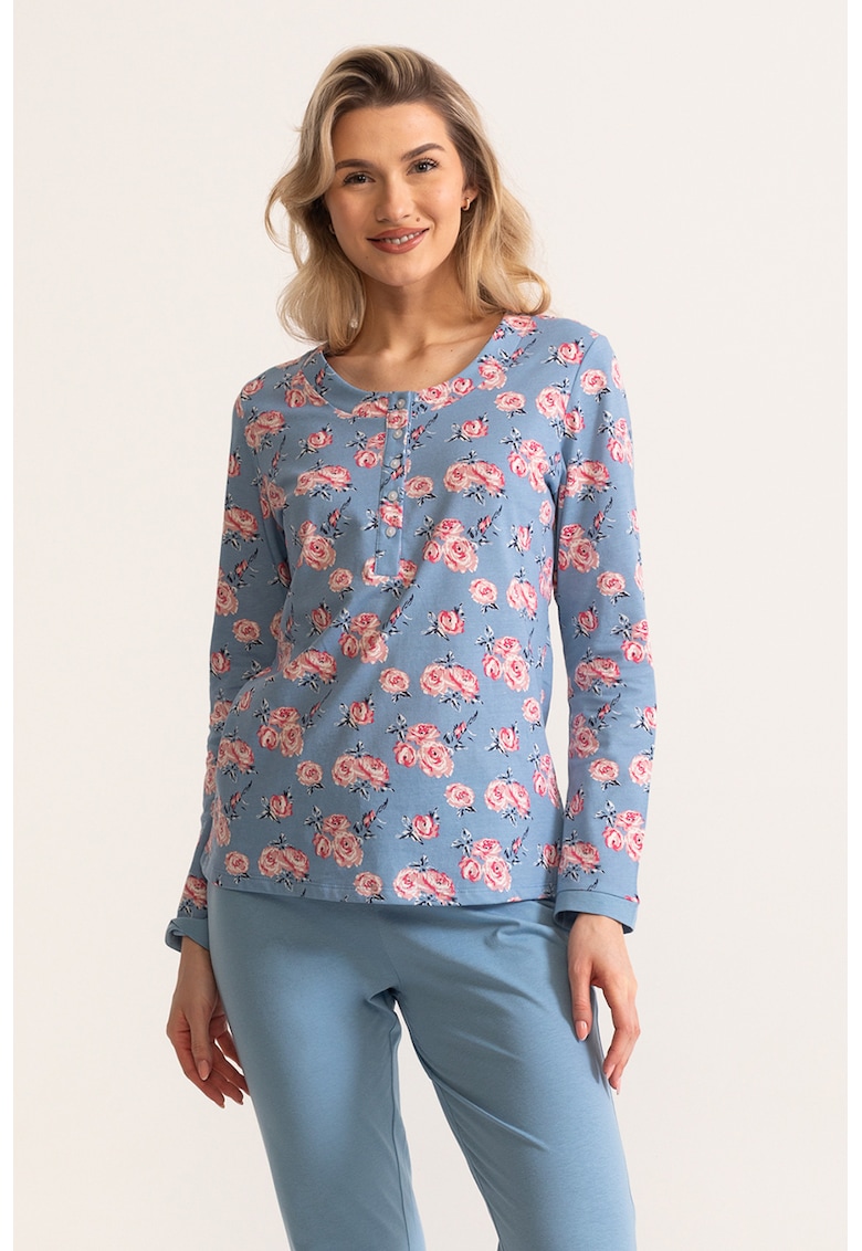 Характеристики Тип продукт: пижама Цвят: червен – розово – син Материал: памук Принт: флорален Деколте: кръгло Кройка: стандартна Дължина ръкав: дълъг ръкав Дължина панталон: дълъг Състав Външна част: 100% памук