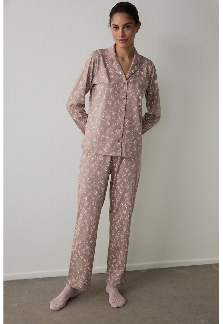 Характеристики Тип продукт: пижама Цвят: бял – светлокафяв Материал: памук Принт: флорален Кройка: стандартна Дължина ръкав: дълъг ръкав Дължина панталон: дълъг Закопчаване: копчета Състав Външна част: 100% памук