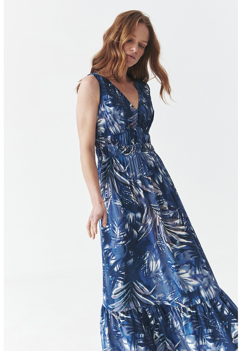 Характеристики Цвят: бял – тъмносин Стил: ежедневен Материал: вискоза Принт: тропически Кройка: разкроена Дължина: дълга Деколте: шпиц деколте Дължина ръкав: без ръкав Закопчаване: без закопчаване Състав Външна част: 100% вискоза