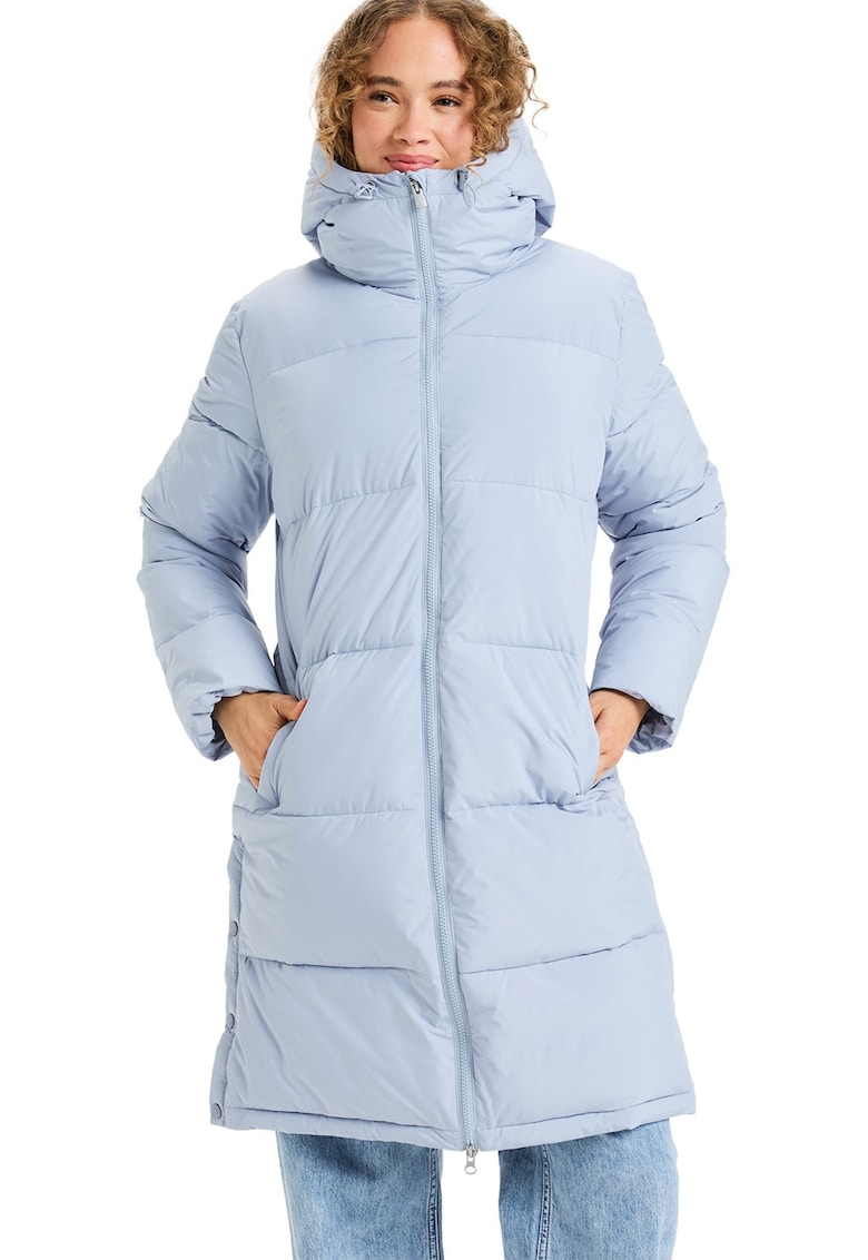 Характеристики Тип продукт: зимно яке Цвят: пастелносин Принт: без принт Материал: полиестер Дължина: дълга Кройка: стандартна Яка: висок Качулка: с качулка Дължина ръкав: дълъг ръкав Джобове: 2 скосени встрани Закопчаване: цип Състав Външна част: 100% полиестер