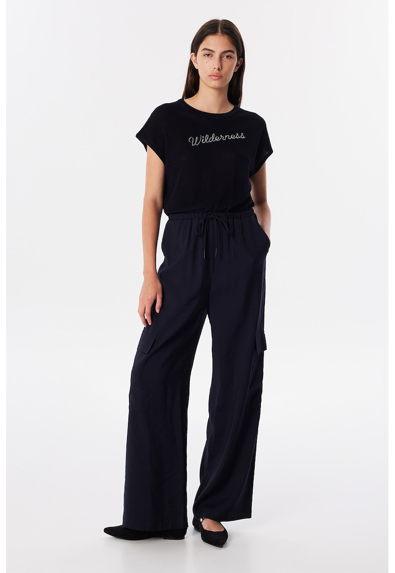 Общи характеристики Цвят: черен Кройка: стандартна Стил: ежедневен Материал: вискоза – полиамид Дължина ръкав: къс ръкав Дължина панталон: дълъг Принт: с принт Детайли: отовр на гърба с копче – регулируема талия с връзка – 2 джоба с капачета встрани Състав Външна част: 75% …