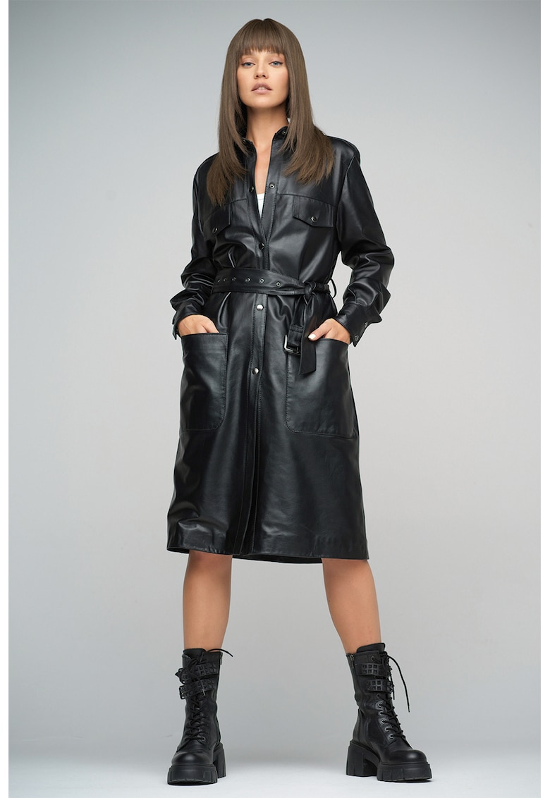 Относно Дълъг кожен тренч с колан – Черен AA Vesa