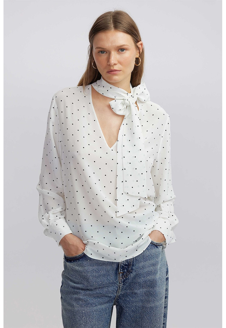 Характеристики Цвят: черен – мръснобял Принт: точки Стил: ежедневен Кройка: стандартна Закопчаване: без закопчаване Материал: вискоза Деколте: шпиц с панделка Ръкави: маншети с копчета Дължина ръкав: дълъг ръкав Състав Външна част: 100% вискоза