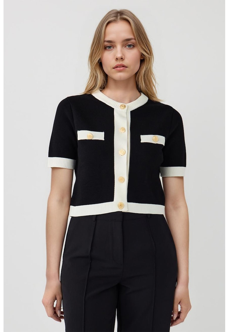 Характеристики Тип продукт: жилетка Цвят: слонова кост – черен Принт: без принт Материал: полиестер – вискоза Модел: обло Кройка: стандартна Закопчаване: копчета Дължина ръкав: къс ръкав Състав Външна част: 73% вискоза – 27% полиестер