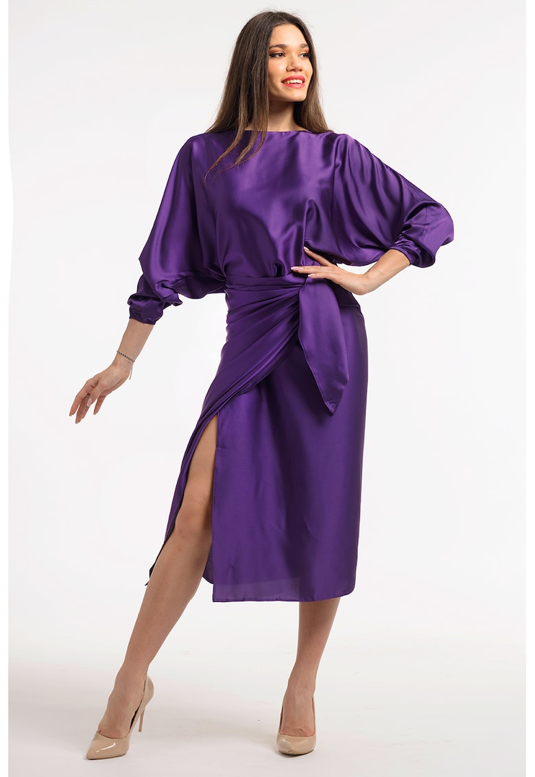 Характеристики Цвят: аметист Стил: елегантен Материал: вискоза – еластан Принт: без принт Кройка: застъпена Дължина: средна Ръкави: тип прилеп Дължина ръкав: три четвърт Детайли: цепка встрани – сатиниран ефект Състав Външна част: 60% вискоза – 40% еластан