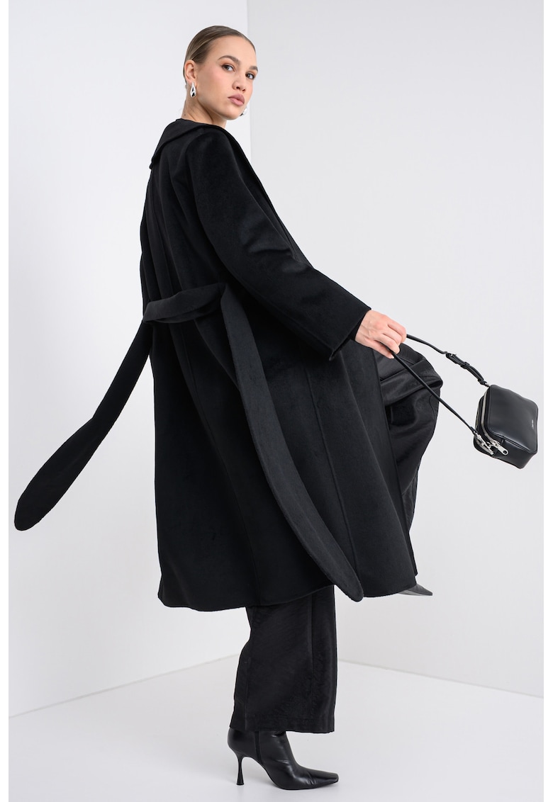 Характеристики Тип продукт: палто Цвят: черен Принт: без принт Стил: елегантен Материал: синтетичен – вълна Кройка: свободна Яка: шал-яка Дължина ръкав: дълъг ръкав Джобове: странични Закопчаване: колан Състав Външна част: 82% полиестер – 18% вълна Подплата: 100% полиестер …