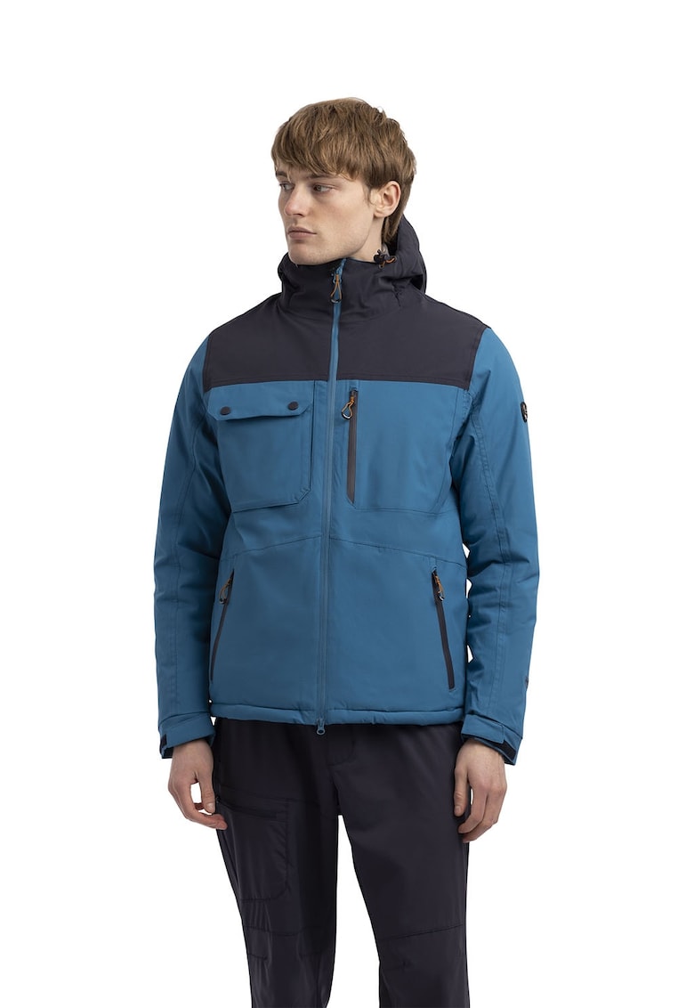 Характеристики Тип продукт: зимно яке Цвят: черен – син Материал: полиестер Кройка: стандартна Принт: без принт Качулка: с качулка Яка: средновисока Дължина ръкав: дълъг ръкав Джобове: 3 с цип – един с капаче отпред Закопчаване: цип Състав Външна част: 100% полиестер