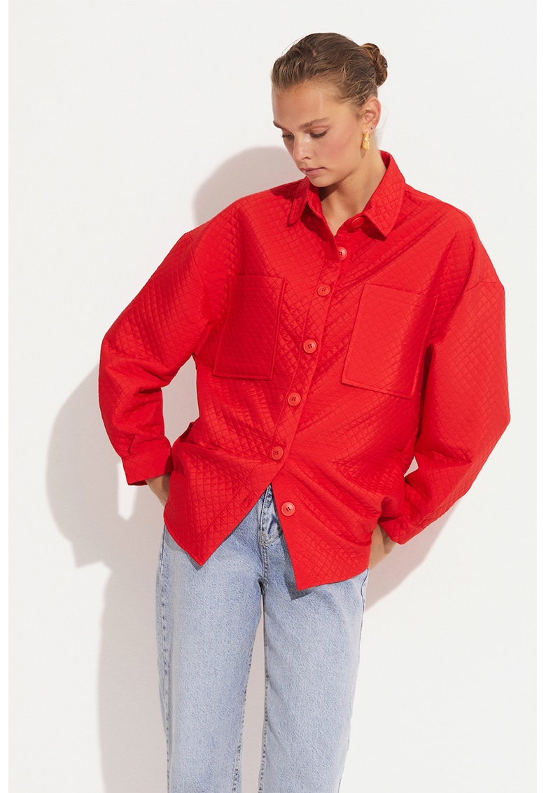 Характеристики Тип продукт: яке Стил: риза Цвят: червен Принт: без принт Материал: синтетичен Дължина: къса Кройка: уголемена Яка: заострена Качулка: без качулка Дължина ръкав: дълъг ръкав Джобове: 2 на гърдите Детайли: капитониран дизайн Закопчаване: копчета Състав …