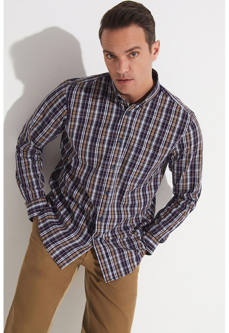 Характеристики Цвят: оранжев – ултрамарин синьо – мръснобял Материал: памук Принт: каре Стил: ежедневен Кройка: стандартна Яка: класическа Дължина ръкав: дълъг ръкав Състав Външна част: 100% памук
