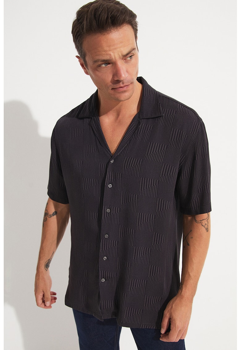 Характеристики Цвят: антрацитно сиво – тъмносин Материал: вискоза Принт: каре Стил: ежедневен Кройка: стандартна Яка: ревери с цепка Дължина ръкав: къс ръкав Закопчаване: копчета Състав Външна част: 90% алуминий – 8% памук – 2% полиамид