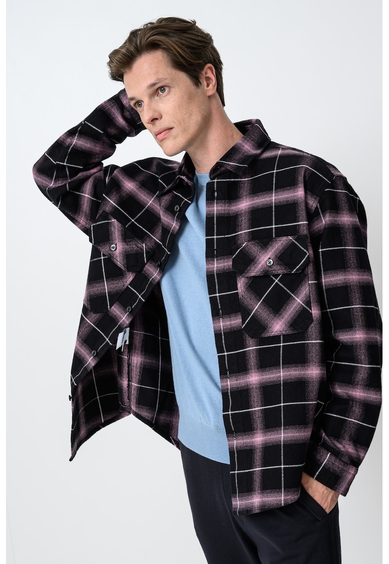 Характеристики Цвят: черен – лилав Материал: памук Принт: каре Стил: ежедневен Кройка: свободна Яка: класическа Ръкави: свободнопадащи Дължина ръкав: дълъг ръкав Джобове: 2 на гърдите с капачета и копчета Закопчаване: копчета Състав Външна част: 100% памук