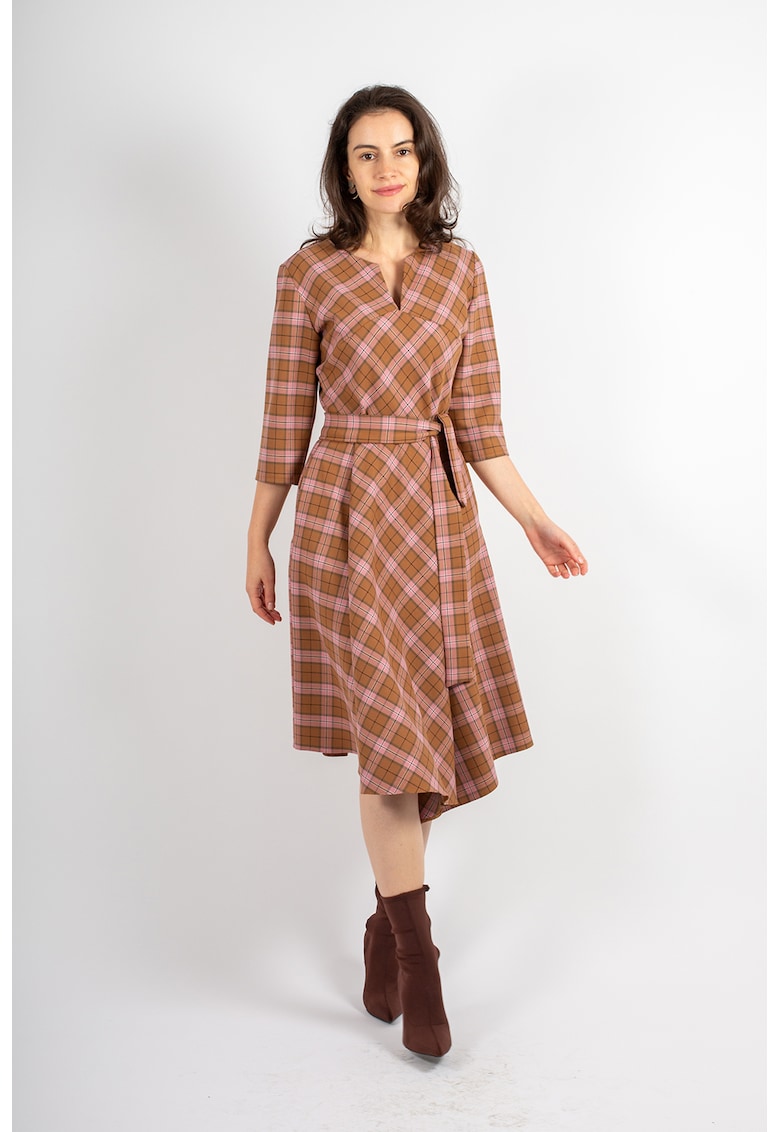 Карирана рокля Margot с вълна и асиметричен подгъв – Кафяв/Пастелнорозов Couture de Marie на ниска цена