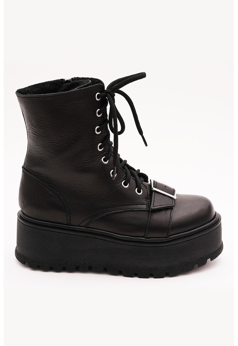 Характеристики Тип: с платформа Цвят: черен Материал: eстествена кожа Принт: без принт Стил: ежедневен Връх: кръгъл Тип на подметката: скосена платформа Цвят на метала: сребрист – черен Закопчаване: катарама – връзки – цип Състав Горна част: кожа Материал интериор: вълна …
