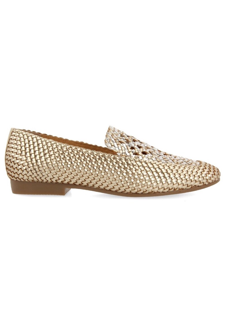 Характеристики Тип продукт: мокасини Цвят: златист Материал: eстествена кожа Принт: без принт Стил: ежедневен Връх: кръгъл Тип на подметката: плоска Закопчаване: без закопчаване Състав Горна част: кожа Материал интериор: кожа Материал подметка: други материали