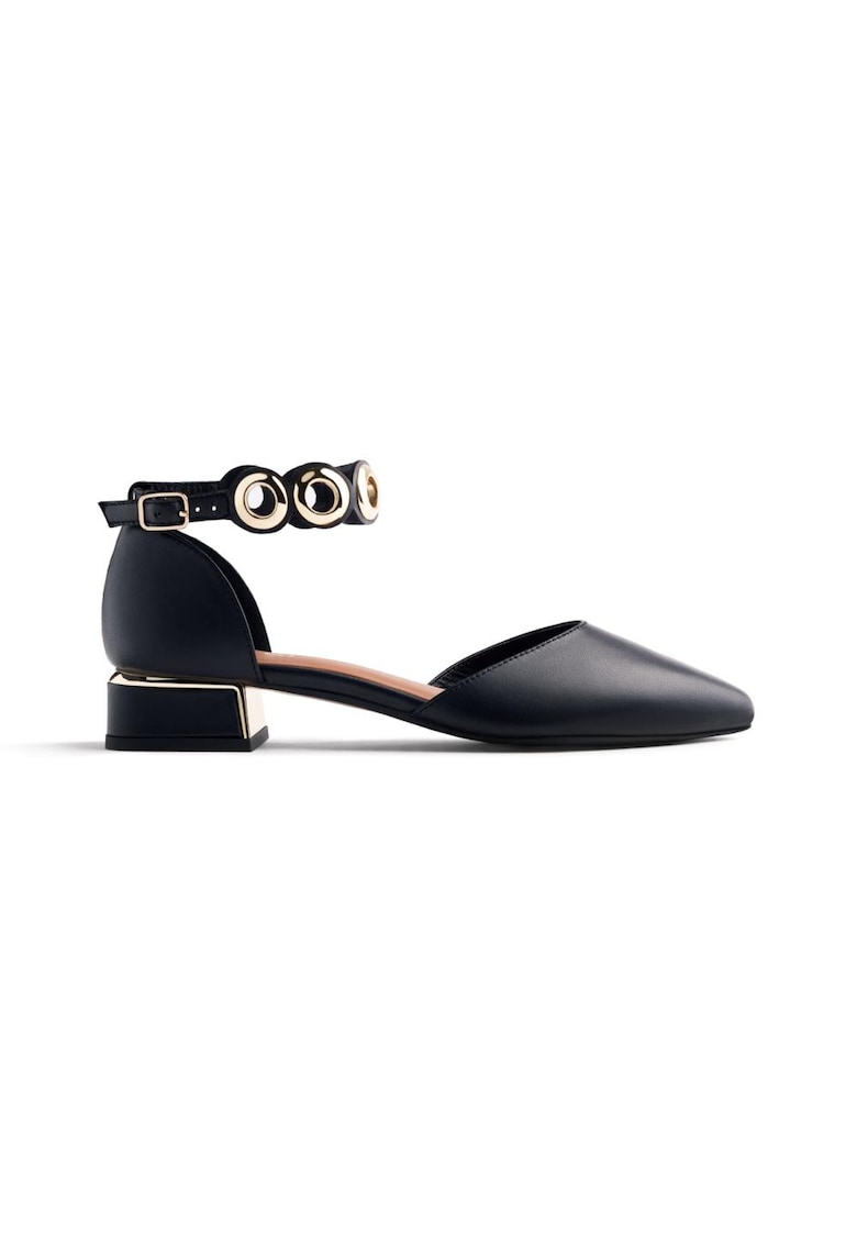 Характеристики Тип: с ток Материал: eстествена кожа Цвят: черен Принт: без принт Стил: елегантен Връх: остър Тип на тока: масивен Закопчаване: катарама Състав Горна част: кожа Материал интериор: кожа – друг материал Материал подметка: други материали