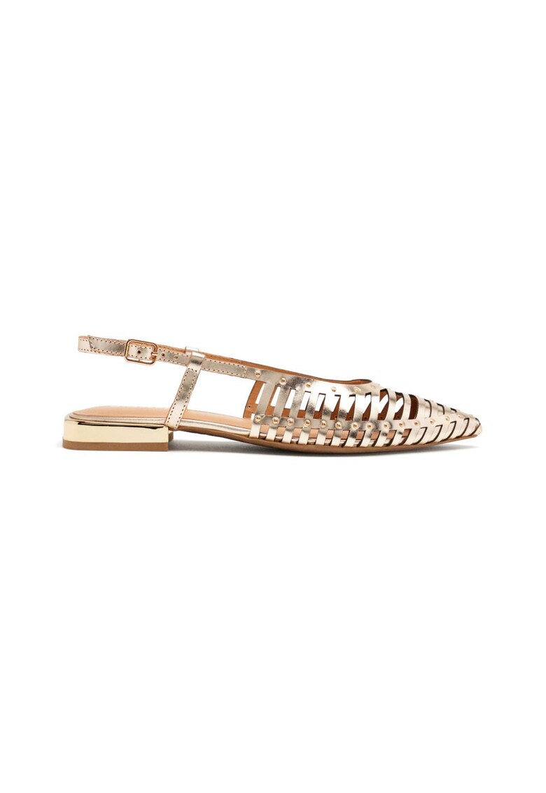 Характеристики Тип: ниски Материал: eстествена кожа Цвят: златист Принт: без принт Стил: ежедневен Връх: остър Тип на подметката: плоска Закопчаване: катарама Състав Горна част: кожа Материал интериор: кожа Материал подметка: други материали