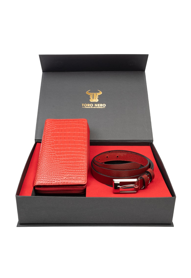 Относно Комплект дамски портфейл и колан естествена кожа червен Gia-Slim Toro Nero