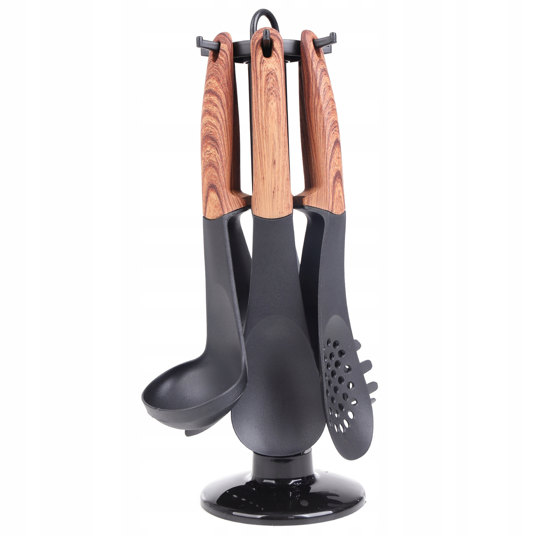 За Комплект кухненски прибори с поставка Royalty Line RL-U03, 7 части, Полипропилен, До 210C, Без PFOA, Черен
