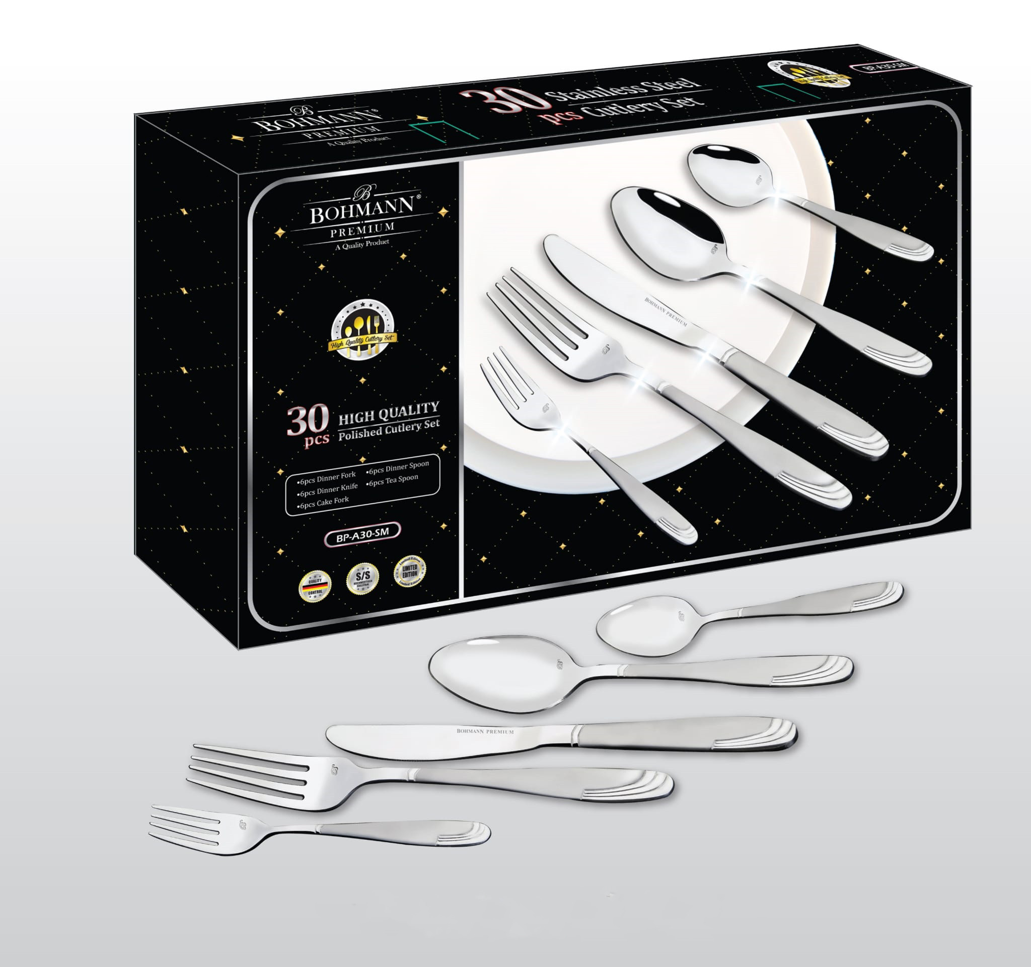 За Комплект прибори за хранене Bohmann BP A30-SM, Кутия, 30 бр, Инокс