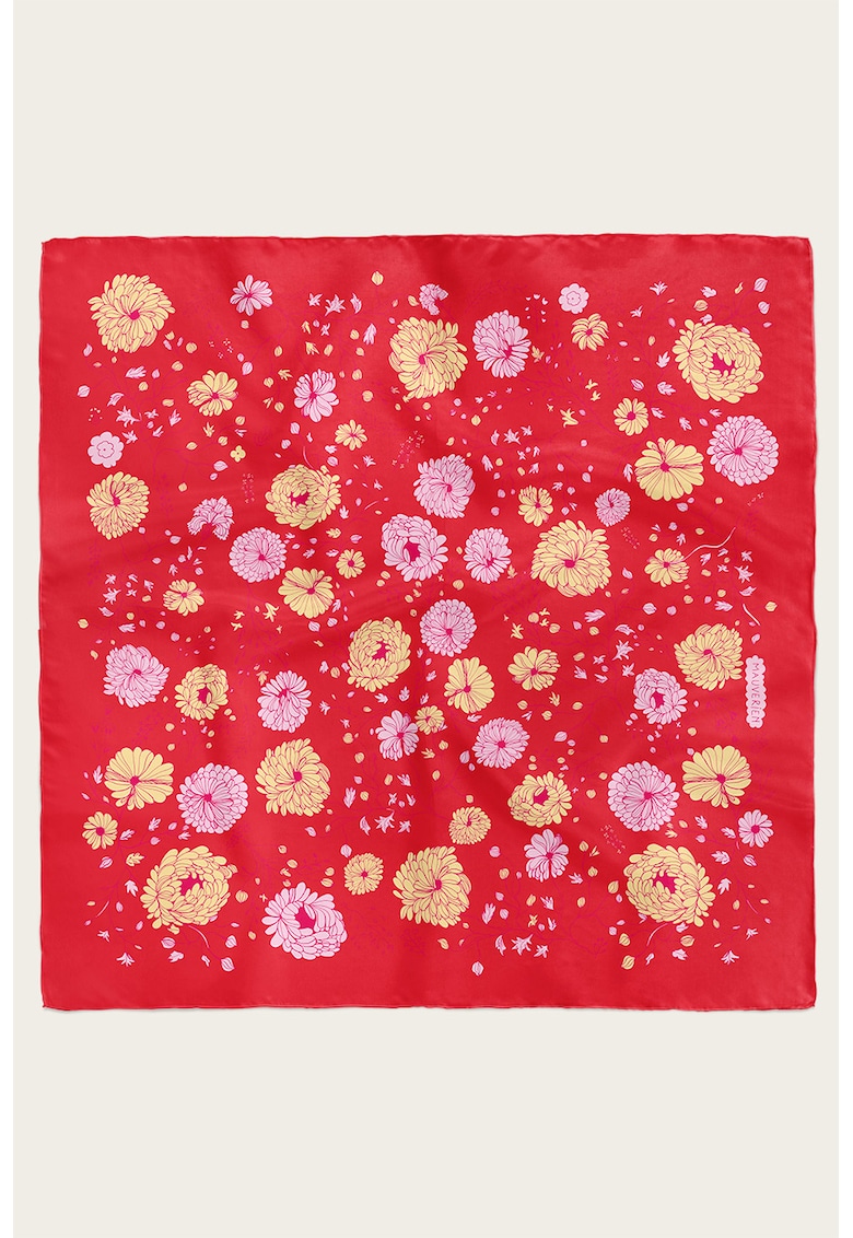 Характеристики Тип продукт: тънък шал Цвят: пастелнорозов – сламеножълт – аленочервен Стил: ежедневен Сезон: пролет-лято – есен-зима Принт: флорален Материал: коприна Състав Външна част: 100% коприна Размери Размери (см): 90 x 90 cm