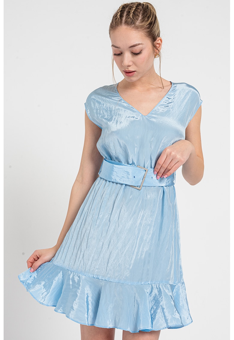 Характеристики Цвят: ледено синьо Стил: елегантен Материал: вискоза – полиамид Принт: без принт Кройка: разкроена Дължина: къса Деколте: шпиц Дължина ръкав: без ръкав Детайли: колан Състав Външна част: 81% вискоза – 19% полиамид Информация за модел Моделът е облечен с …
