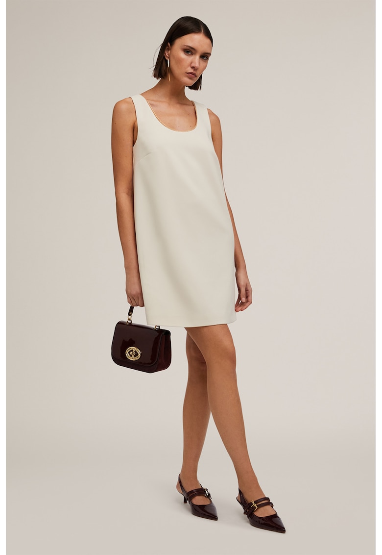 Характеристики Цвят: мръснобял Стил: елегантен Материал: синтетичен Принт: без принт Кройка: права Дължина: къса Деколте: кръгло Дължина ръкав: без ръкав Закопчаване: без закопчаване Състав Външна част: 95% полиестер – 5% еластан Подплата: 100% полиестер