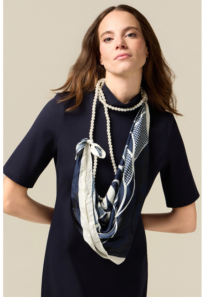 Характеристики Цвят: бял – тъмносин Стил: ежедневен Материал: вискоза – полиамид Принт: без принт Кройка: вталена Дължина: къса Деколте: кръгло Дължина ръкав: къс ръкав Детайли: шал Състав Външна част: 67% вискоза – 27% полиамид – 6% еластан Апликации: 100% полиамид