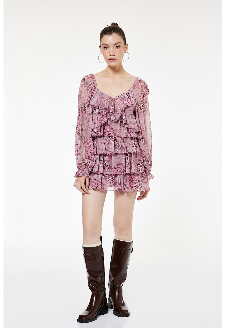 Характеристики Цвят: прашно розово Стил: ежедневен Материал: полиестер Принт: флорален Кройка: права Дължина: къса Деколте: в v“ Ръкави: разкроени маншети Дължина ръкав: дълъг ръкав Детайли: набирания Състав Външна част: 100% полиестер Подплата: 100% полиестер“