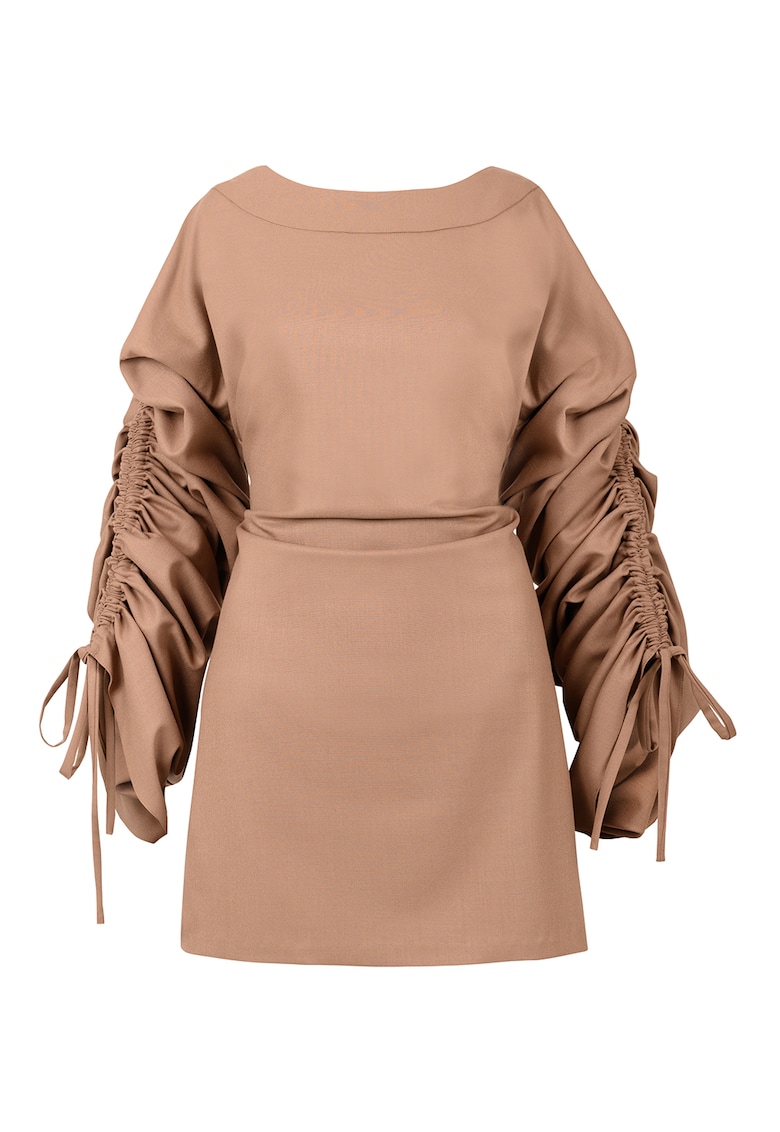 Относно Къса рокля Mocha с набрани ръкави – Тъмнобежово на Alina Cernatescu