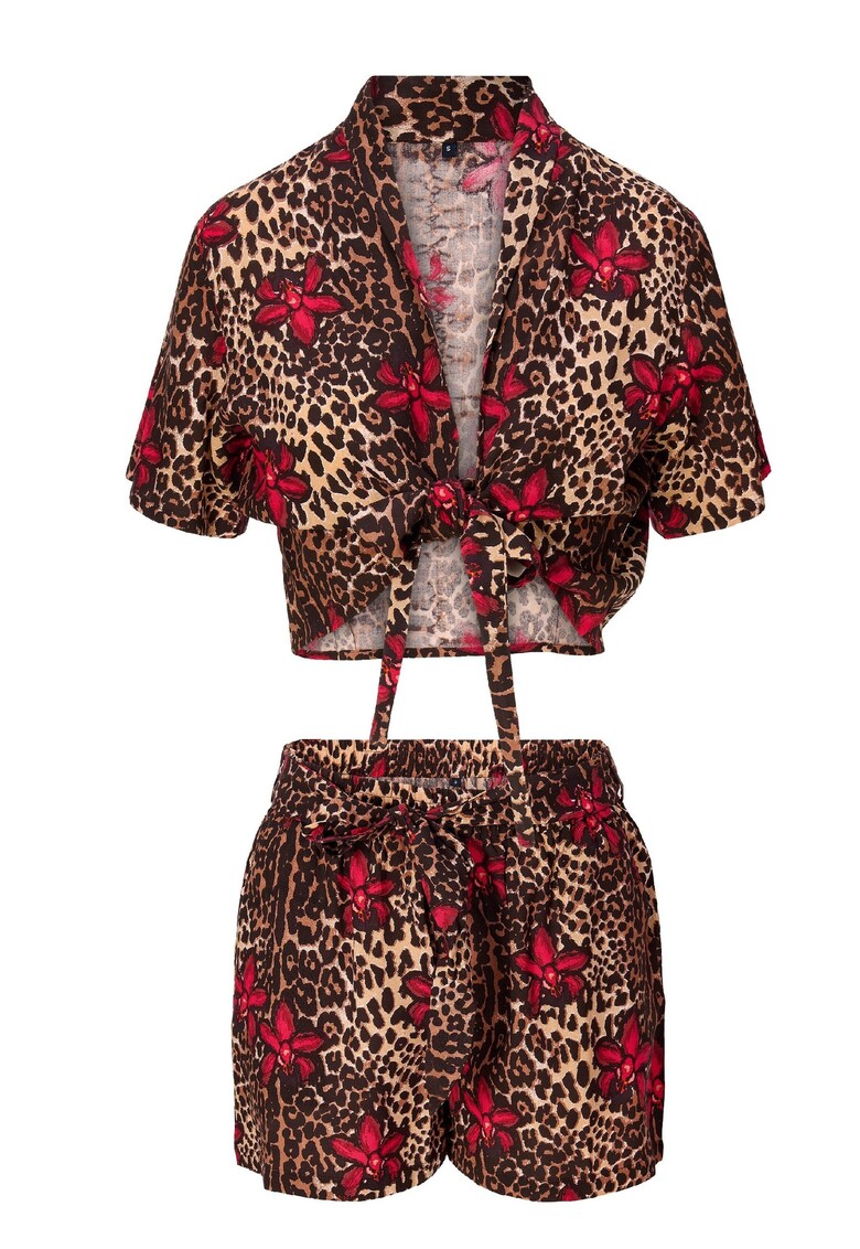 Характеристики Тип продукт: риза – панталон Цвят: кафяв – тъмночервен Материал: вискоза Принт: животински принт – тропически Деколте: шпиц Дължина ръкав: къс ръкав Състав Външна част: вискоза
