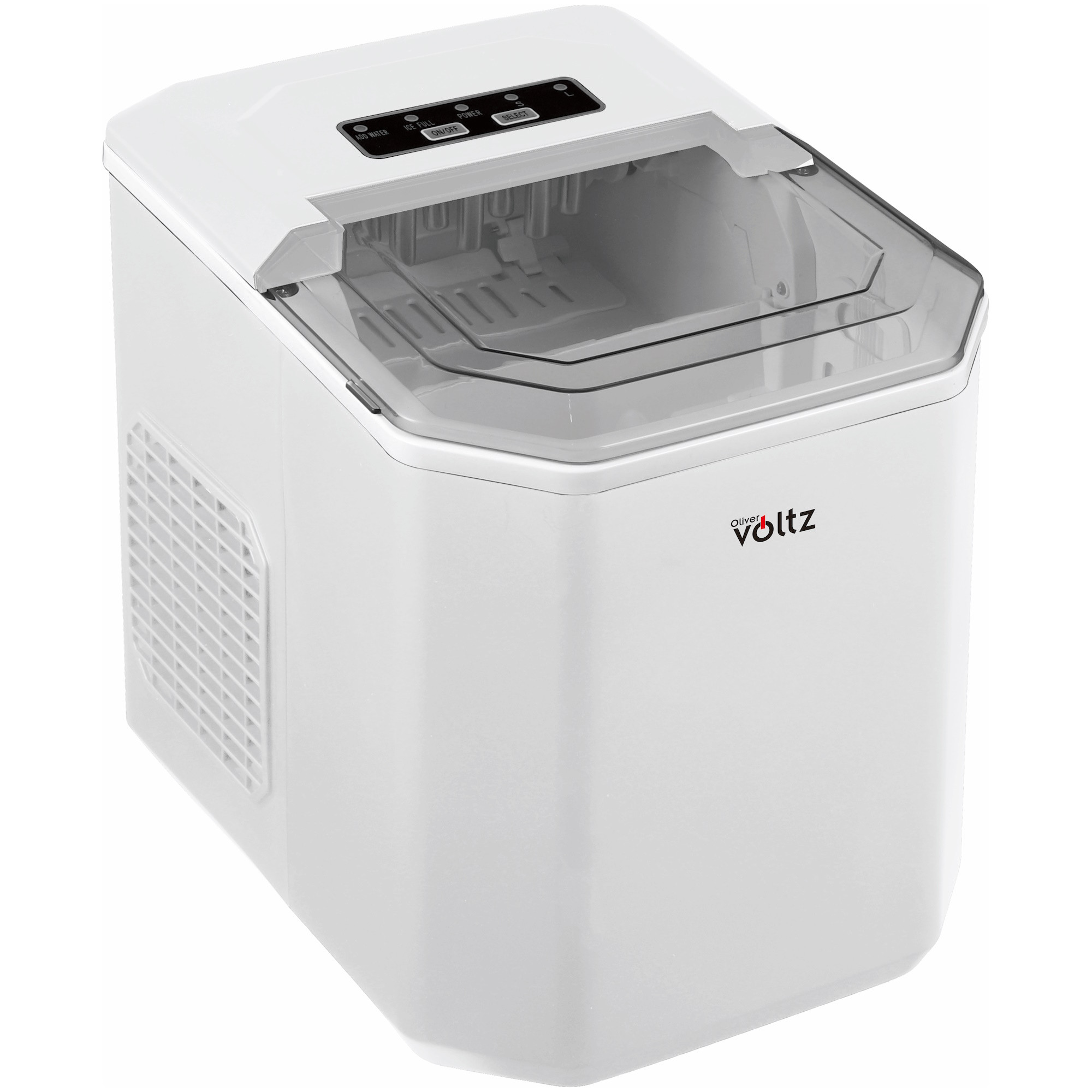 За Ледогенератор Oliver Voltz OV51447B, 120W, 12 кг/24 часа, 1.3 л, 9 кубчета за цикъл работа, Индикатор за лед и вода, Бял