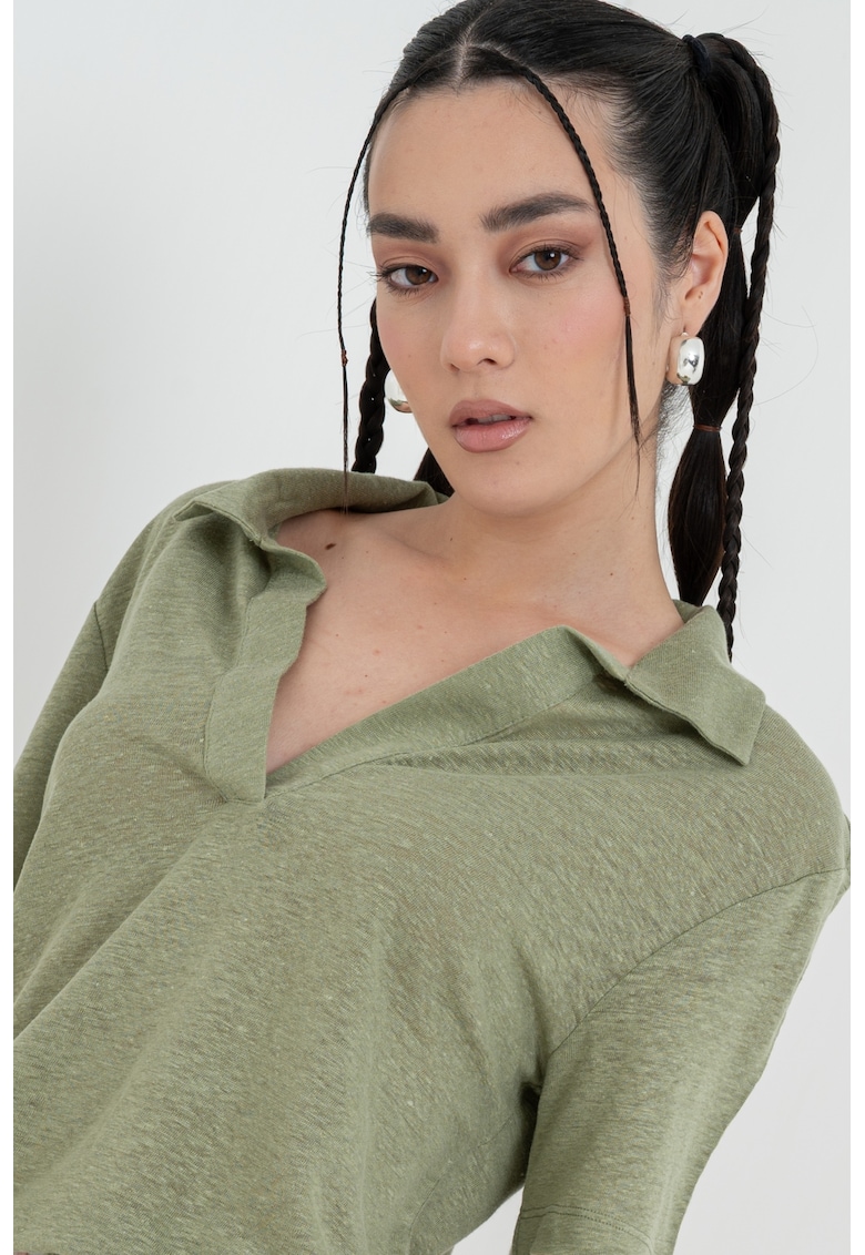 Характеристики Цвят: бледо каки Принт: без принт Материал: лен Кройка: свободна Модел: v-образно деколте – поло Дължина ръкав: средна Състав Външна част: 100% лен Информация за модел Моделът е облечен с размер S. Размер на модела: 170 cm височина – 78 cm Гръдна обиколка – 60 cm Талия …