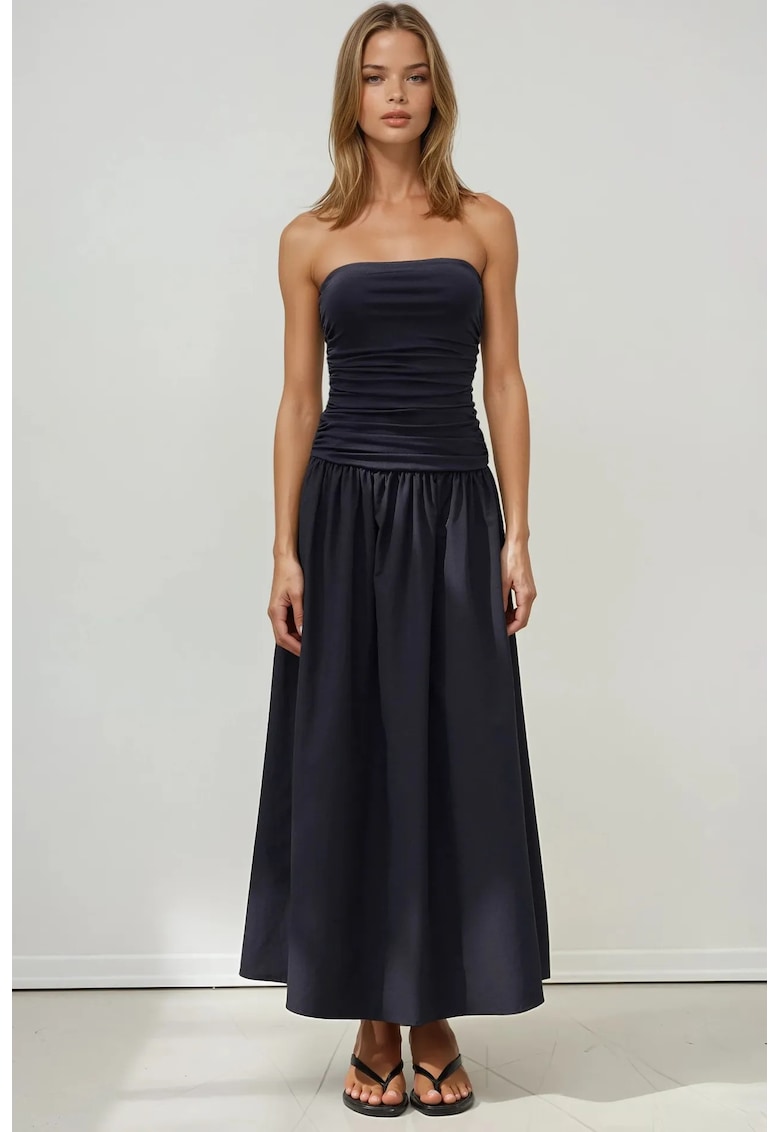 Макси рокля – без презрамки – волан – тъмносин – текстил HiCCUP