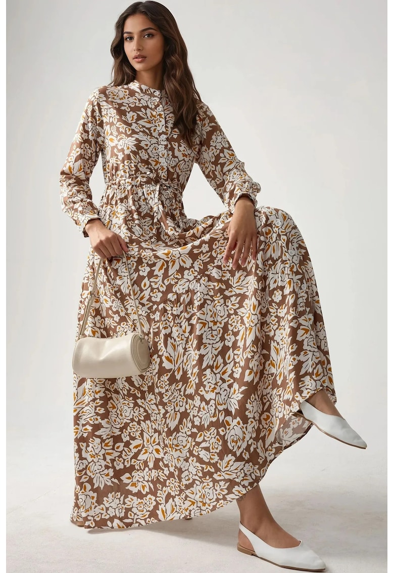 Макси рокля – щампа – изискана яка – бежово – вискоза HiCCUP на ниска цена